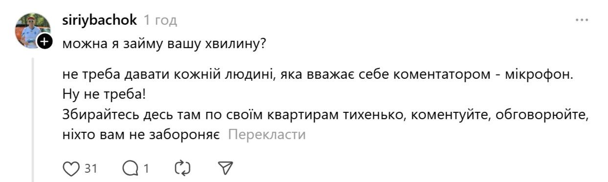 - Уважаемый комментатор, не лезьте к нам, пока на комментаторских мостиках не появятся люди, которые действительно умеют комментировать циклические виды спорта. Потому что мне уже надоело смотреть спорт без звука. И было бы хорошо, чтобы у вас наконец появились причинно-следственные связи между массовым любительским спортом и спортом высших достижений.