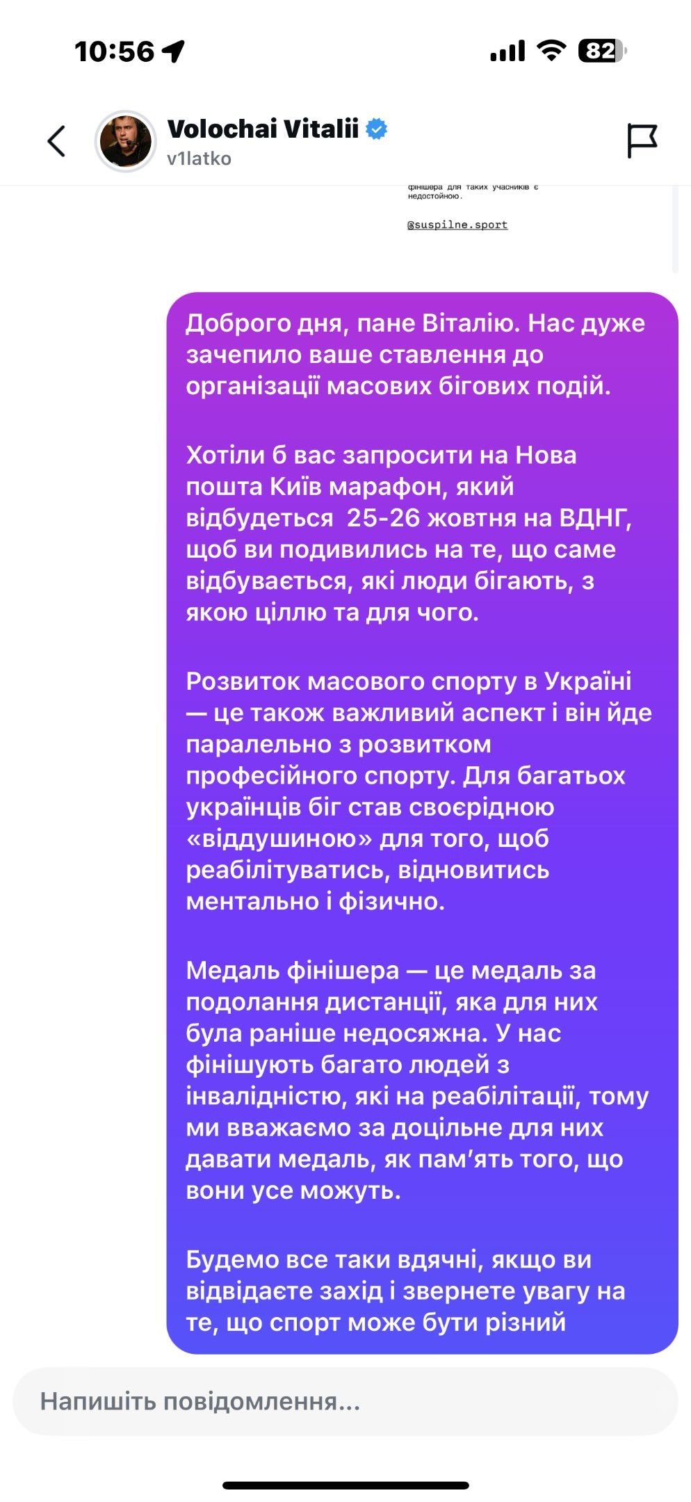 К дискуссии присоединились организаторы благотворительного марафона NewRun. Они написали Виталию личное сообщение, в котором пригласили на Киевский марафон в конце октября.