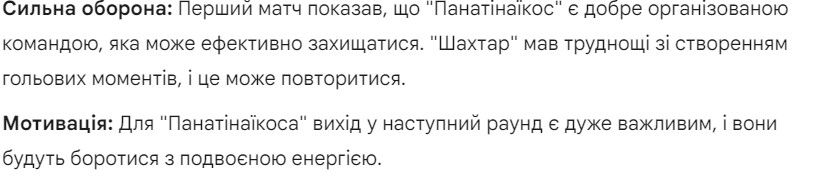 По мнению ИИ, Шахтер будет фаворитом ответного матча против Панатинаикоса. Нулевая ничья в Греции дает стратегическое преимущество дончанам перед второй игрой. Такой результат в выездном матче считается положительным для команды, которая гостила на поле соперника. Однако второй поединок будет очень сложным для обоих коллективов.
