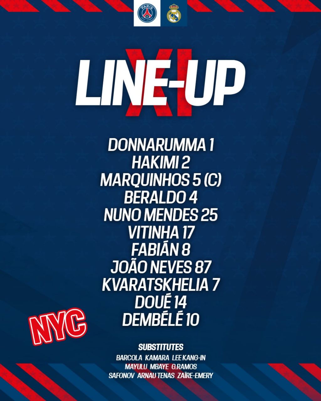 ПСЖ: Доннарумма – Хакими, Маркиньос, Беральдо, Мендеш – Витинья, Невеш, Руис – Дуэ, Дембеле, Кварацхелия.