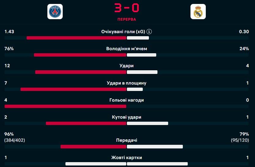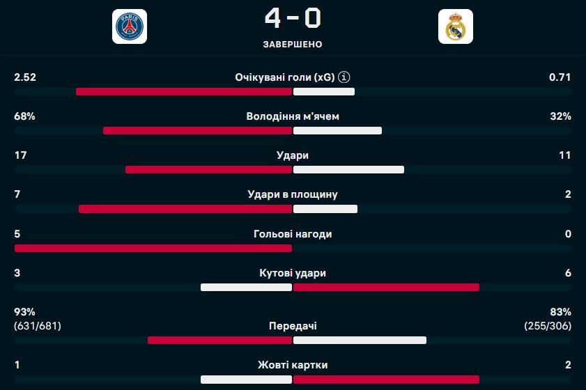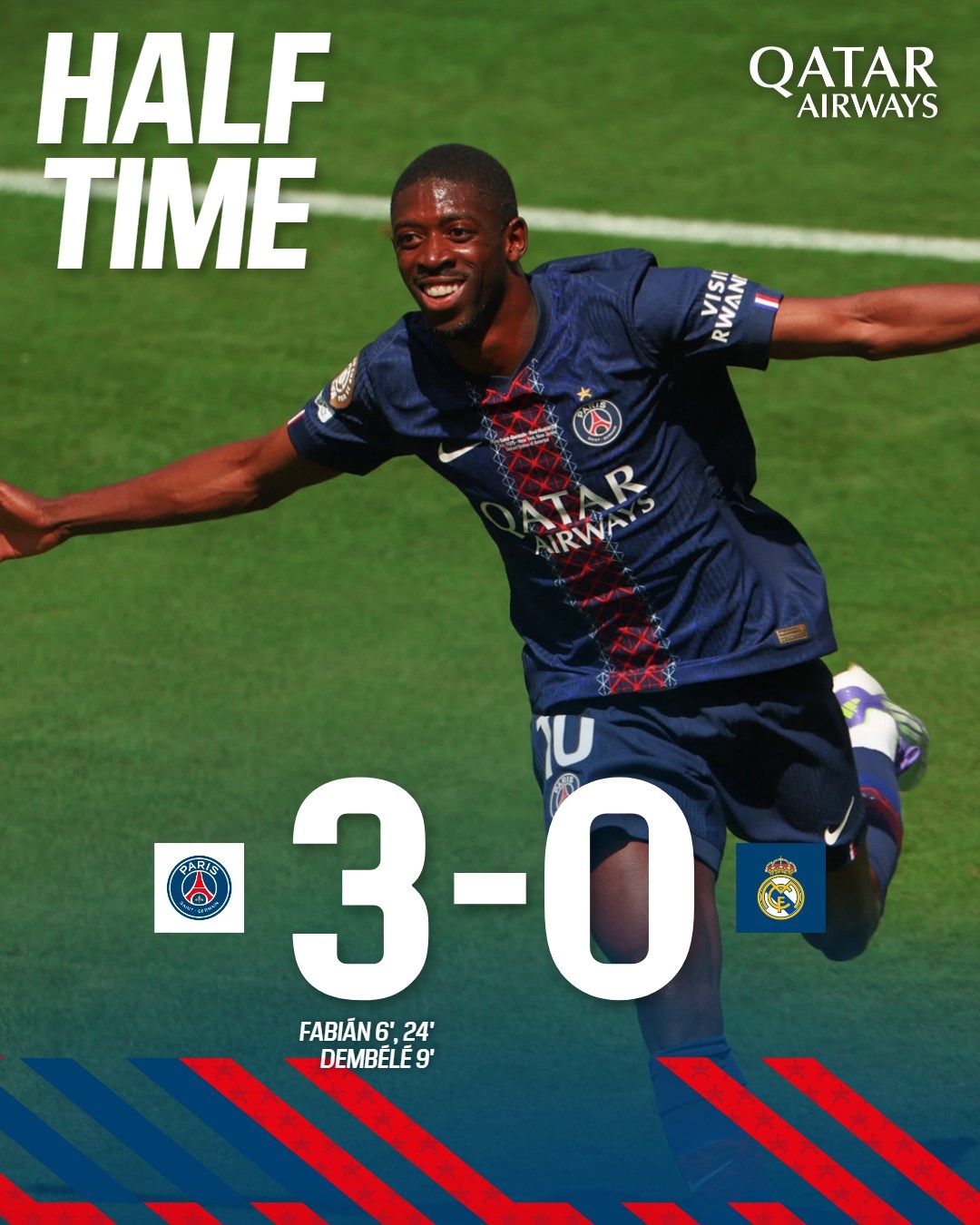 ГОООООЛ!!! Рамуш доводит счет до 4:0 после успешной контратаки и паса от Барколя. Видео гола: Дальний удар от Милитао по центру не стал проблемой для Доннаруммы. Гюлер уступил место на поле Васкесу. Последняя замена от ПСЖ. Ли Кан Ин вышел вместо Мендеша. Мощный дальний выстрел от Франа Гарсии пришелся в Беральдо, который спас свои ворота. Сразу желтая карточка Дани Карвахалю за опасную игру ногой в Хакими. Карвахаль вышел вместо Гонсало Гарсии. Теперь у ПСЖ два изменения. Заир-Эмери и Маюлу заменили Руиса и Дуэ. Тройная замена от Реала. Модрич, Милитао и Браим Диас вышли вместо Асенсио, Винисиуса и Беллингема. Барколя едва не воспользовался подарком от Асенсио, когда убежал в штрафную площадку Реала с центра поля. Однако прострел у Брэдли не удался. Первая замена от ПСЖ. Рамуш и Барколя вышли вместо Дембеле и Кварацхелии. Винисиус пытался качнуть Хакими, но марокканец заблокировал удар бразильца. Удар Гюлера выше ворот после скидки от Мбаппе. Удар от Гонсало Гарсии заблокирован. Невеш сорвал опасную контратаку Реала и получает желтую карточку. Мендеш опасно пробил с острого угла, но Куртуа парировал этот удар. Судья добавил три минуты. Стойка от Кварацхелии! Грузин из опасной позиции попал в каркас ворот. ПСЖ контролирует мяч в центре поля и особо не форсирует события. Желтая карточка Чуамене за грубый фол. ГООООЛ!!!!!! Третий гол от ПСЖ!!! Французы разорвали защиту Реала в контратаке, Хакими вырезал пас на свободного Руиса и тот без проблем оформил дубль. 3:0 Видео гола: Опасный дальний выстрел от Хакими. Рядом со стойкой. Защита Реала сегодня явно не в форме. Асенсио едва не подарил Дуэ выход один на один. Неудачная подача от Арды Гюлера. ГОООООЛ!!!!!!! ПСЖ удваивает счет после очередной ужасной ошибки в защите. Рюдигер на ровном месте подарил Дембеле выход один на один. Француз без проблем реализовал этот шанс. 2:0 Видео гола: ГООООЛ!!!! ПСЖ выходит вперед после привоза от Асенсио. Защитник в своей площадке подарил мяч Дембеле, тот откатил на Руиса и испанец без проблем поразил пустые ворота. 1:0 Видео гола: Какой сейв от Куртуа! Бельгиец парирует выстрел в упор от Дембеле. Неудачный дальний выстрел от Чуамени. Реал проводит предматчевую тренировку. Фанаты ПСЖ уже зажигают!Конец матча