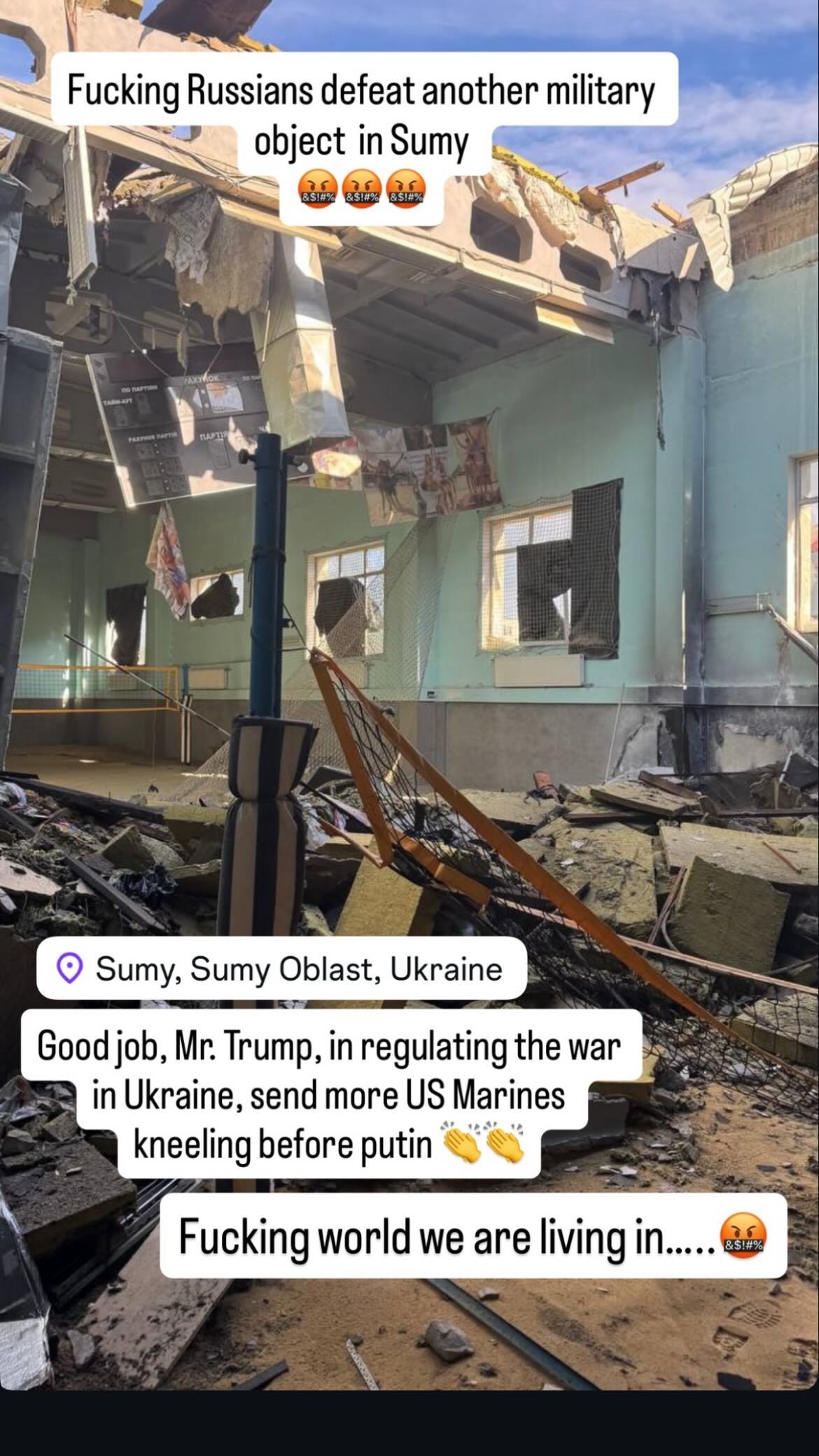 Ё****е россияне снова уничтожили "военный" объект в Сумах. Молодец, мистер Трамп, в урегулировании войны в Украине – присылай еще больше морпехов США, которые становятся на колени перед Путиным. В каком ужасном мире мы живем,