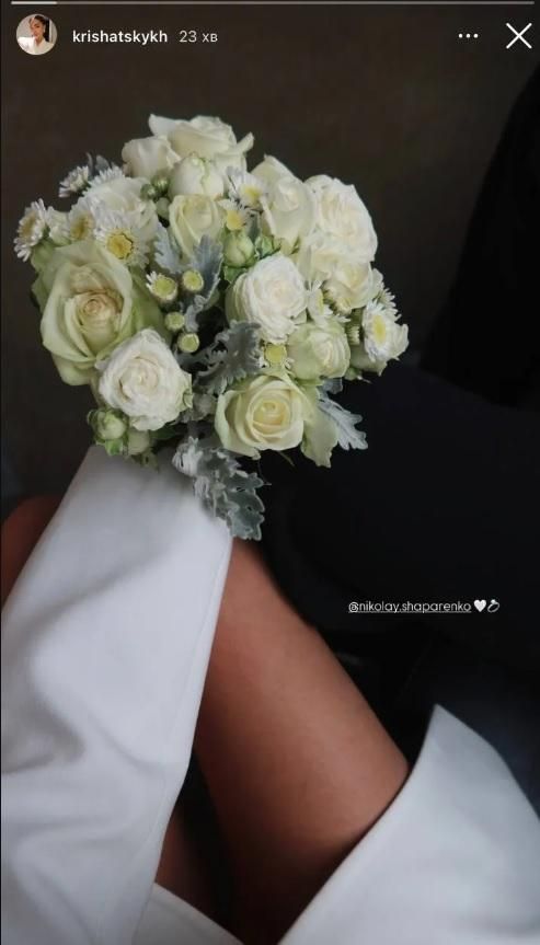 Кристина Шацких в социальных сетях поделилась фотографией, на которой видно букет и часть белого платья. Более того, 22-летняя дочь Максима Шацких обозначила Николая Шапаренко на фото и добавила эмодзи с кольцом и сердечком.