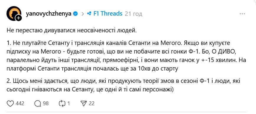Янович о дискуссиях о трансляции Формулы-1 / Скриншот из соцсети Threads