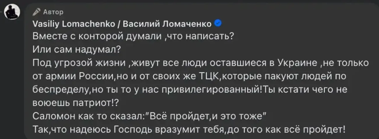 Ответ Ломаченко на пост Притулы / скриншот из фейсбука