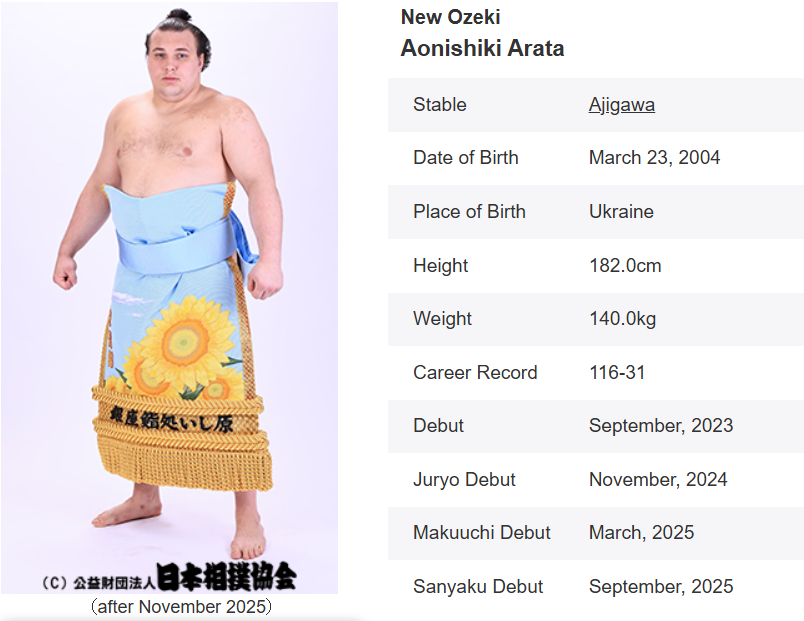 Во вторник, 26 ноября, в Токио Японская ассоциация сумо провела внеочередное заседание. На нем приняли решение предоставить Даниилу Явгусишину, который выступает под именем Аонишики Арата, ранг озэки, сообщает 24 Канал со ссылкой на сайт ассоциации сумо.