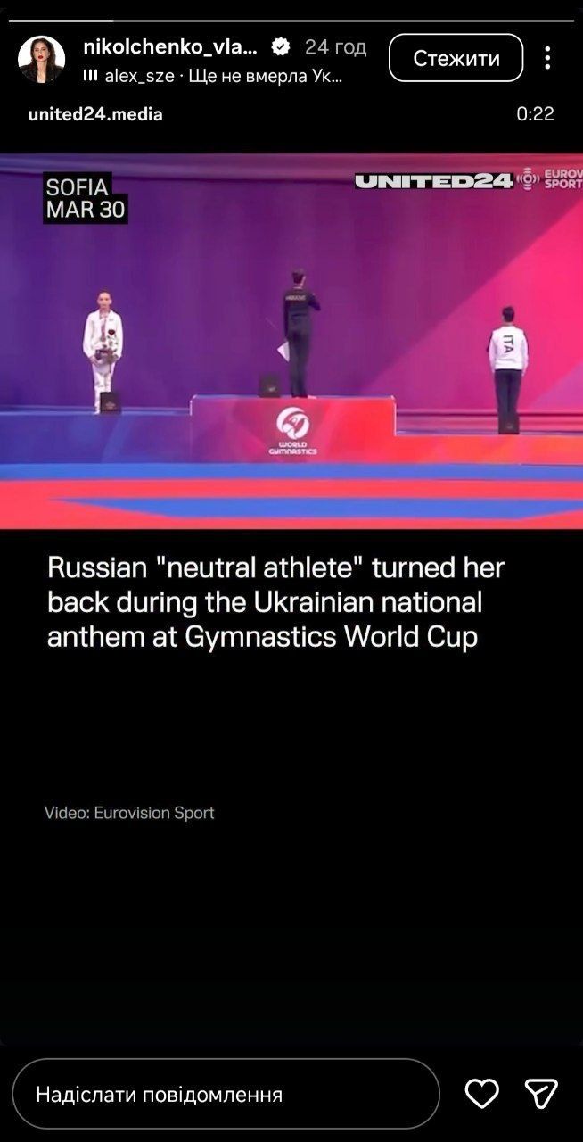 Среди украинцев она подписана на Владиславу Никольченко, украинскую гимнастку, которая в своих сторис опубликовала видео от United 24 об инциденте на церемонии награждения.