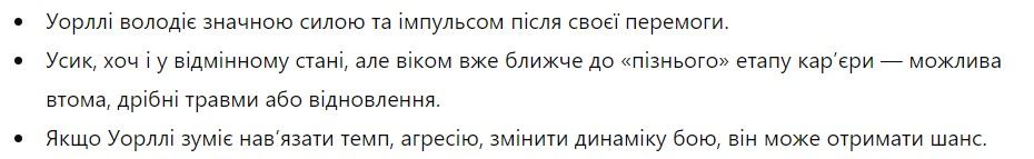 По его мнению, Усик уже достиг очень многого в боксе, поэтому имеет огромный багаж опыта за своей спиной, в частности победы над топовыми соперниками. Также искусственный интеллект отметил технику, выносливость, скорость и мастерство украинского чемпиона, которые могут ему позволить контролировать ход боя.