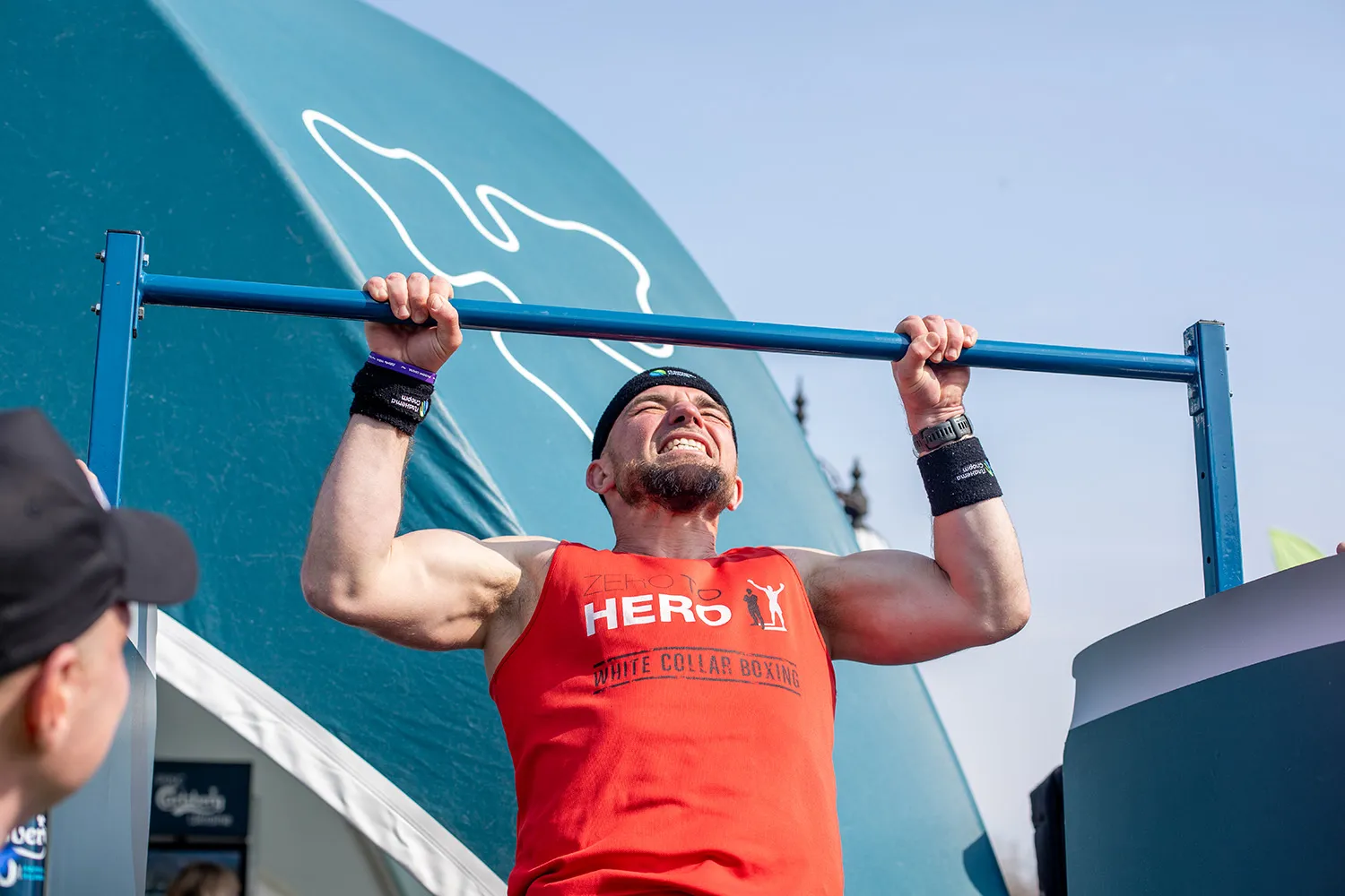 На этот раз "Титан" с хорошим результатом прибежал "десятку", а затем переместился на локацию партнера забега, компании Carlsberg, подтянувшись около 200 раз и собрав все возможные награды!