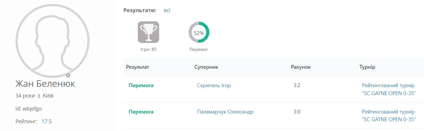 Профайл бывшего борца уже даже появился на сайте Федерации настольного тенниса Украины: 85 игр (52 процента побед).