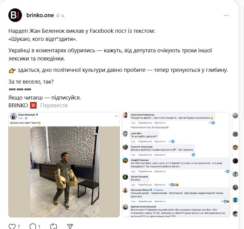 "Ищу, кого отп**дить", – написал Беленюк.