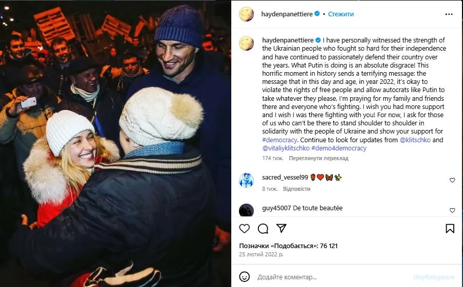 Сообщение Хайден Панеттьери о войне в Украине / скриншот из инстаграма