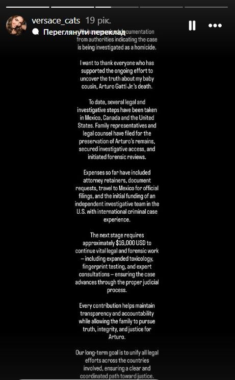 "Витрати вже включають оплату адвокатів, офіційні запити документів, поїздки до Мексики для подання заяв і первинне фінансування незалежної слідчої групи у США, яка має досвід міжнародних кримінальних справ. Наступний етап потребує близько 16 тисяч доларів, щоб продовжити ключові юридичні та судово-медичні дії, зокрема, розширений токсикологічний аналіз, перевірку відбитків пальців та консультації експертів, аби справа просувалася в межах судової процедури. Кожен внесок допомагає зберігати прозорість і відповідальність, дозволяючи родині домагатися правди, чесності та справедливості для Артуро. Довгострокова мета – об’єднати всі юридичні зусилля між трьома країнами, щоб забезпечити чіткий і скоординований шлях до правосуддя", – йдеться у заяві.
