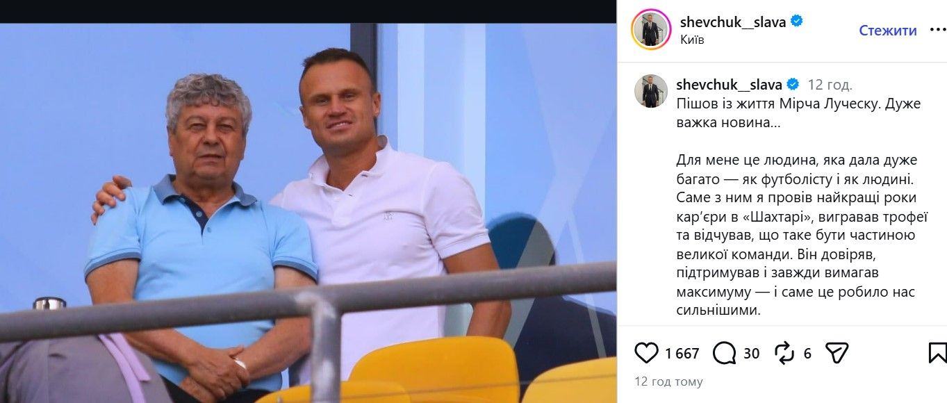 - В'ячеслав Шевчук: "Для мене це людина, яка дала дуже багато – як футболісту і як людині. Саме з ним я провів найкращі роки кар’єри в «Шахтарі», вигравав трофеї та відчував, що таке бути частиною великої команди. Він довіряв, підтримував і завжди вимагав максимуму. І саме це робило нас сильнішими. Містер вмів бачити в гравцях більше, ніж інші. Щирі співчуття рідним і близьким Мірчі Луческу. Для мене це велика особиста втрата".