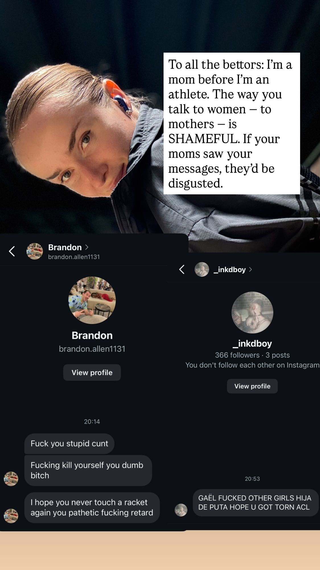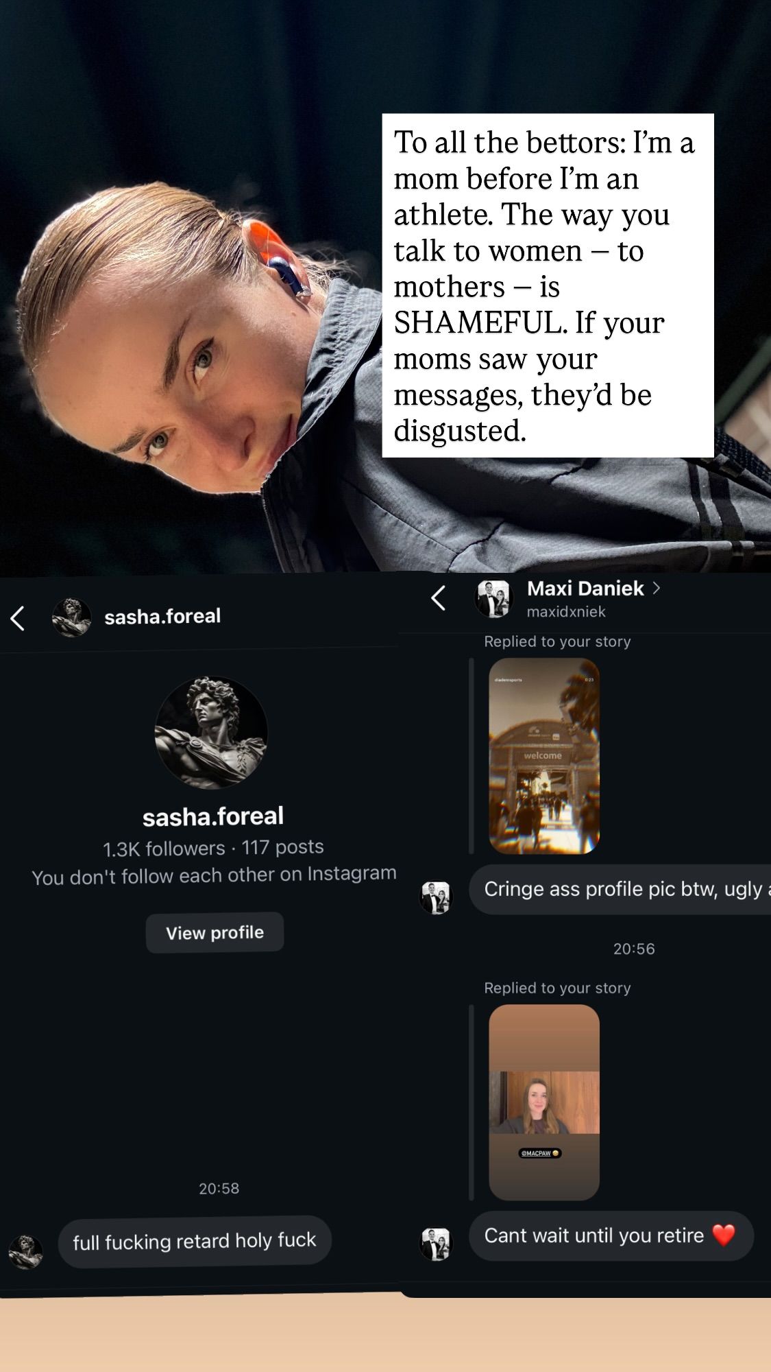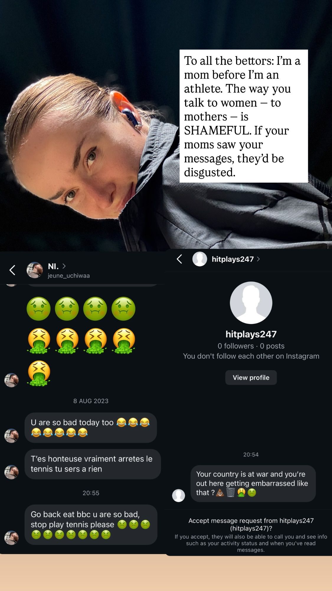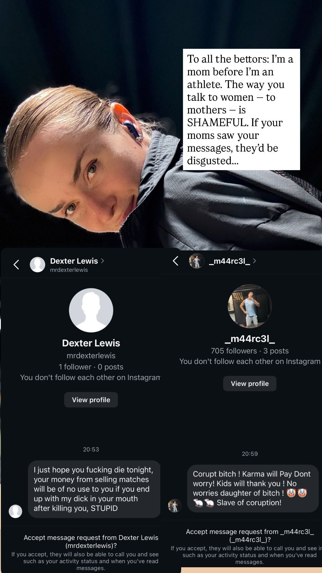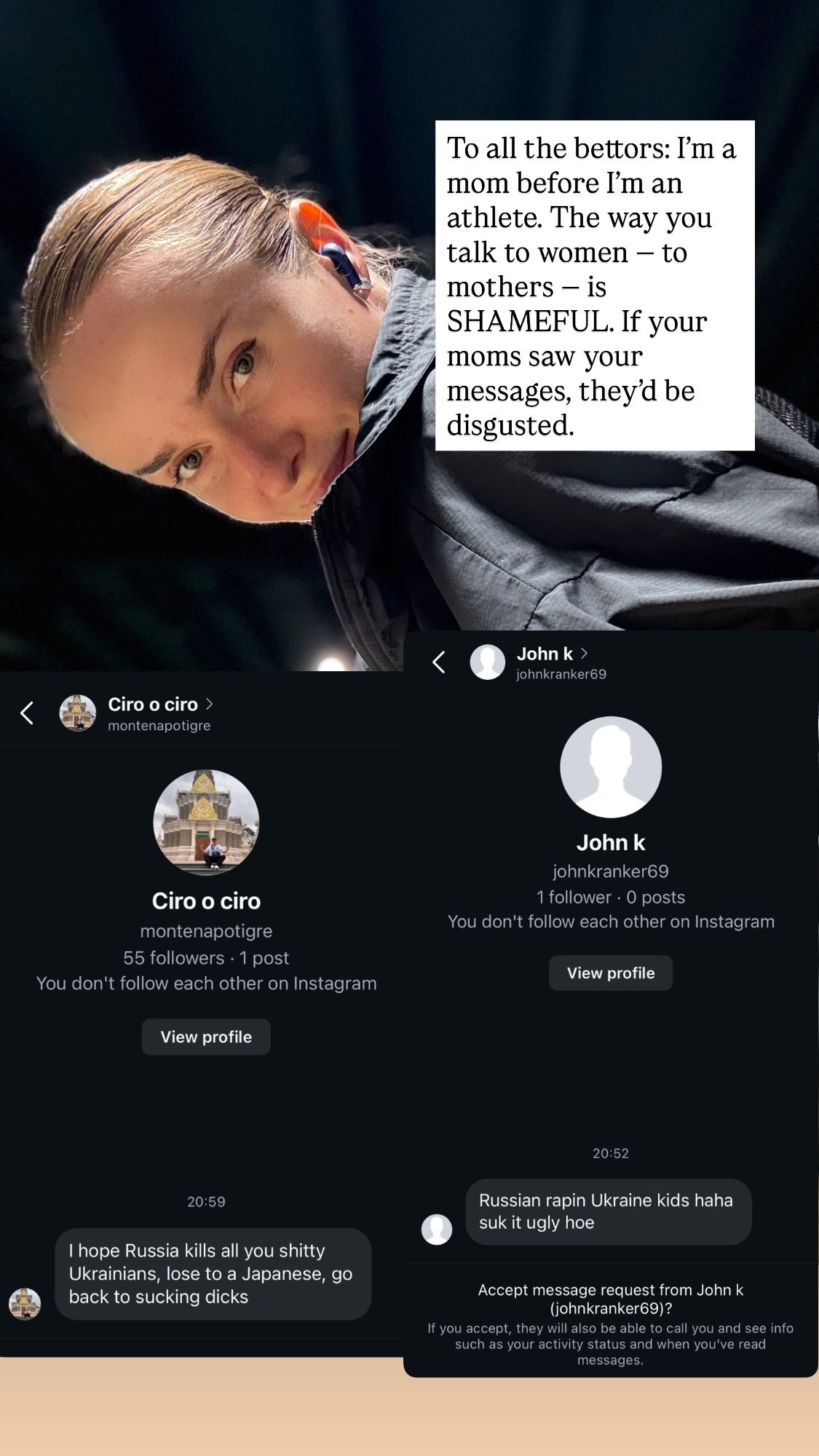 Для всіх ставочників: я – мама насамперед, а вже потім спортсменка. Те, як ви звертаєтеся до жінок, до матерів – це ганьба. Якби ваші мами побачили ваші повідомлення, їм було б соромно за вас,