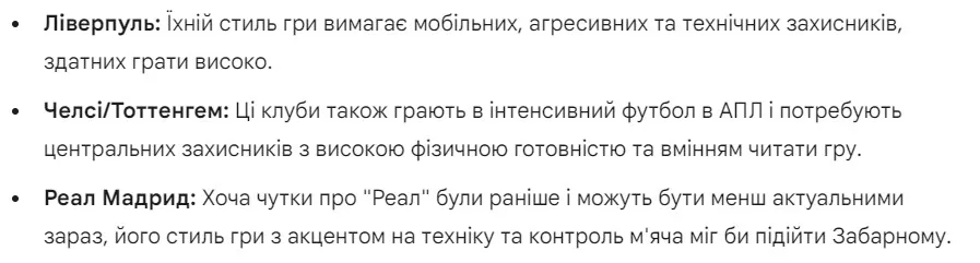 Які клуби є хорошими варіантами для Забарного / Скриншот із Gemini