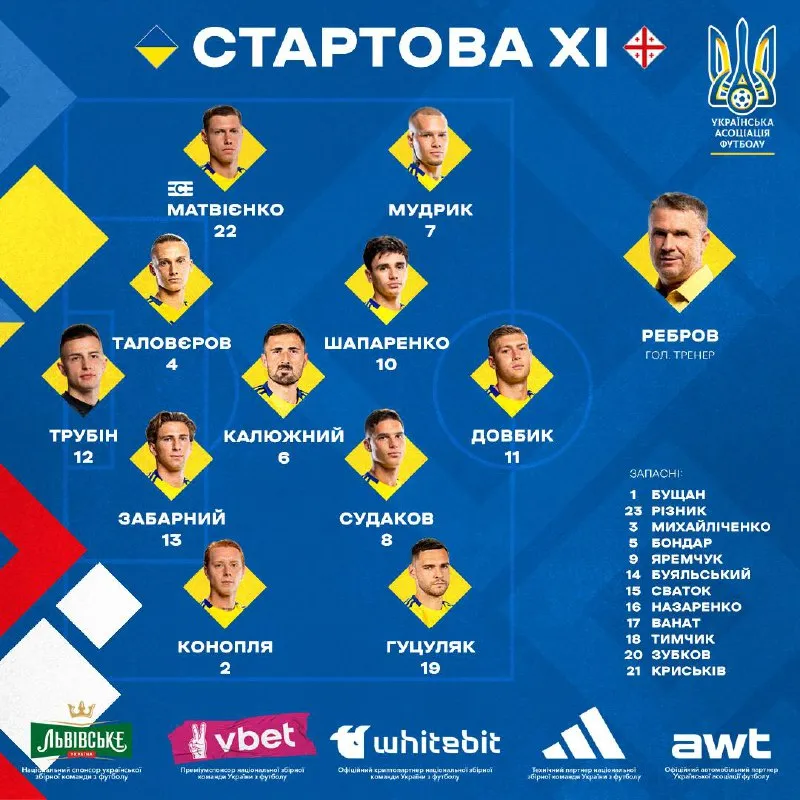 Збірна України: Трубін – Конопля, Забарний, Таловєров, Матвієнко, Калюжний, Судаков, Шапаренко, Гуцуляк, Мудрик, Довбик