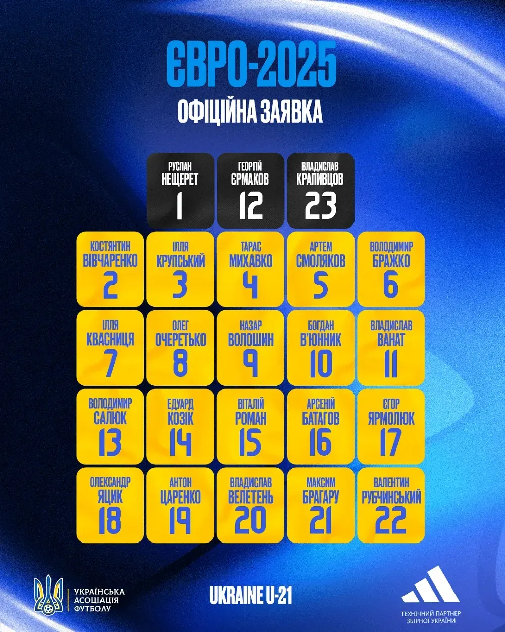 На молодіжний чемпіонат Європи-2025 головний тренер команди Унаї Мельгоса включив у заявку 23-х виконавців. Серед них три воротарі та 20 польових гравців.