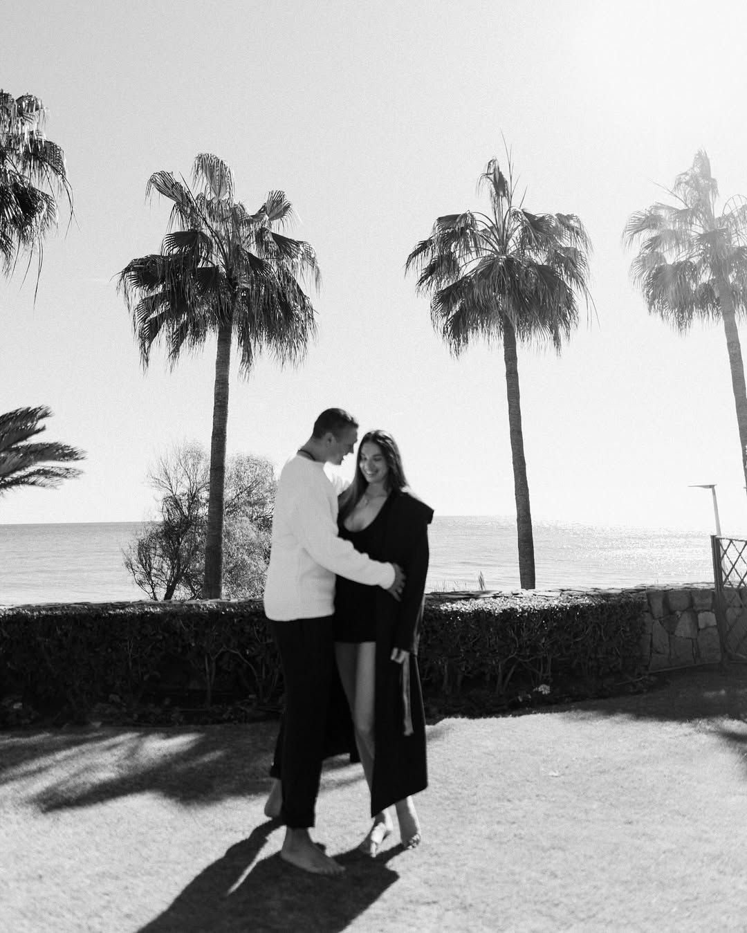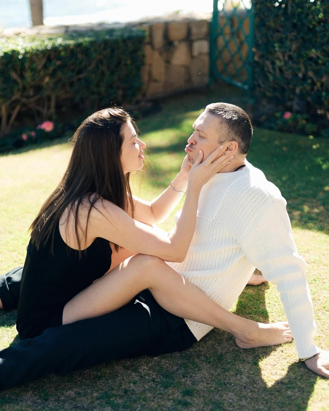 Світлини романтичної фотосесії були зроблені на узбережжі моря на тлі пальм, де пара прогулюється босоніж. Олександр одягнений у білий светр, а Катерина у чорному вбранні.