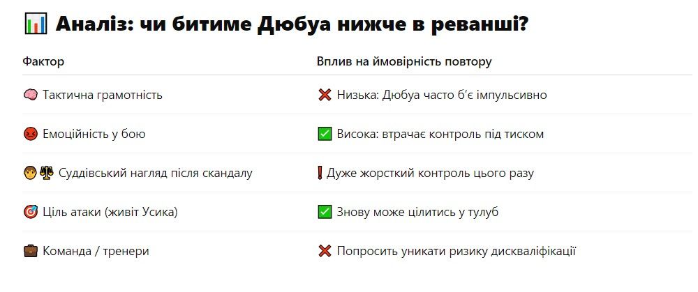 Фінальний вердикт ШІ! Даніель Дюбуа, найімовірніше, знову використовуватиме жорстку і навіть трохи брудну тактику. Швидше за все, що "Динаміт" знову боксувати на межі та може пробити нижче поясу українського боксера, що викличе нові суперечки. Натомість показник удару у пах від Олександра дорівнює майже нулю.