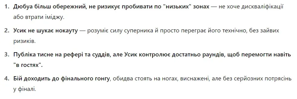 Щодо середини бою, то тут Дюбуа почне більше потрапляти у корпус та частково голову українського чемпіона. ШІ прогнозує, що британець виграє один із раундів (6-й або 7-й). Але це не зіб'є Усика.