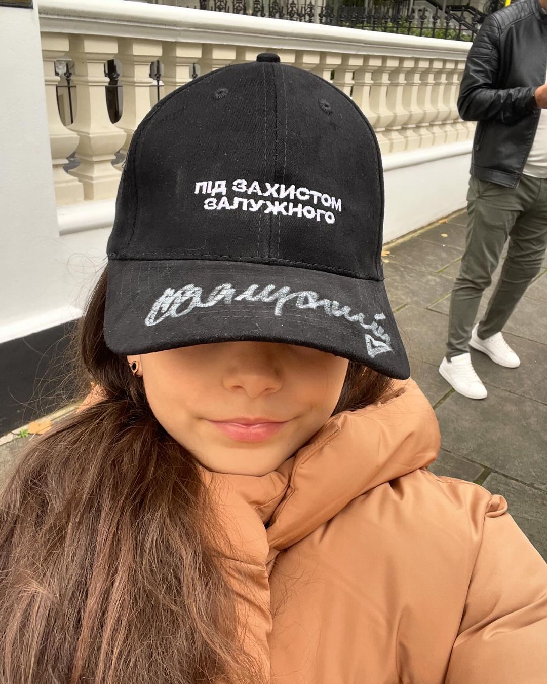Саша прийшла у фірмовій кепці "Під захистом Залужного" та прапором України.