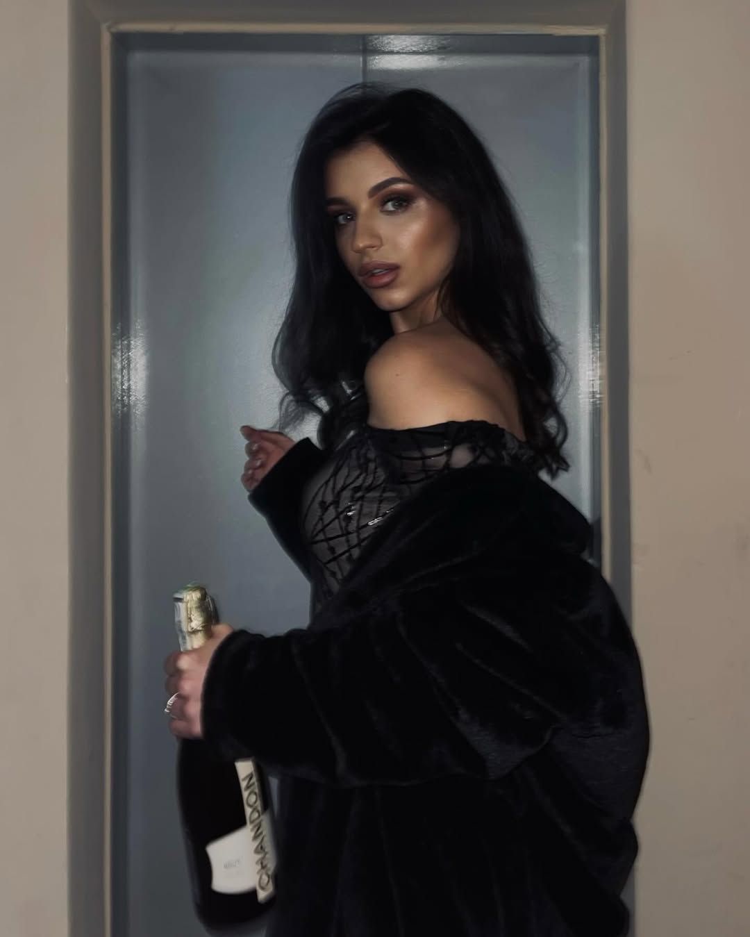 Приваблива Марія засвітила також головний новорічний напій. Для свого розкішного образу панянка використала пляшку ігристого вина.