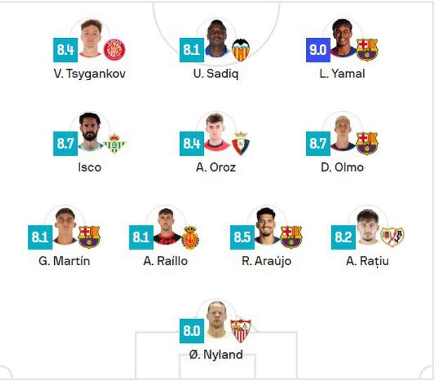У ній знайшлося місце футболістам одразу з восьми клубів, повідомляє 24 Канал із посиланням на SofaScore. Найбільше представництво має Барселона, яка декласувала Реал Сосьєдад (4:0), через що було виділено одразу чотирьох гравців каталонців.
