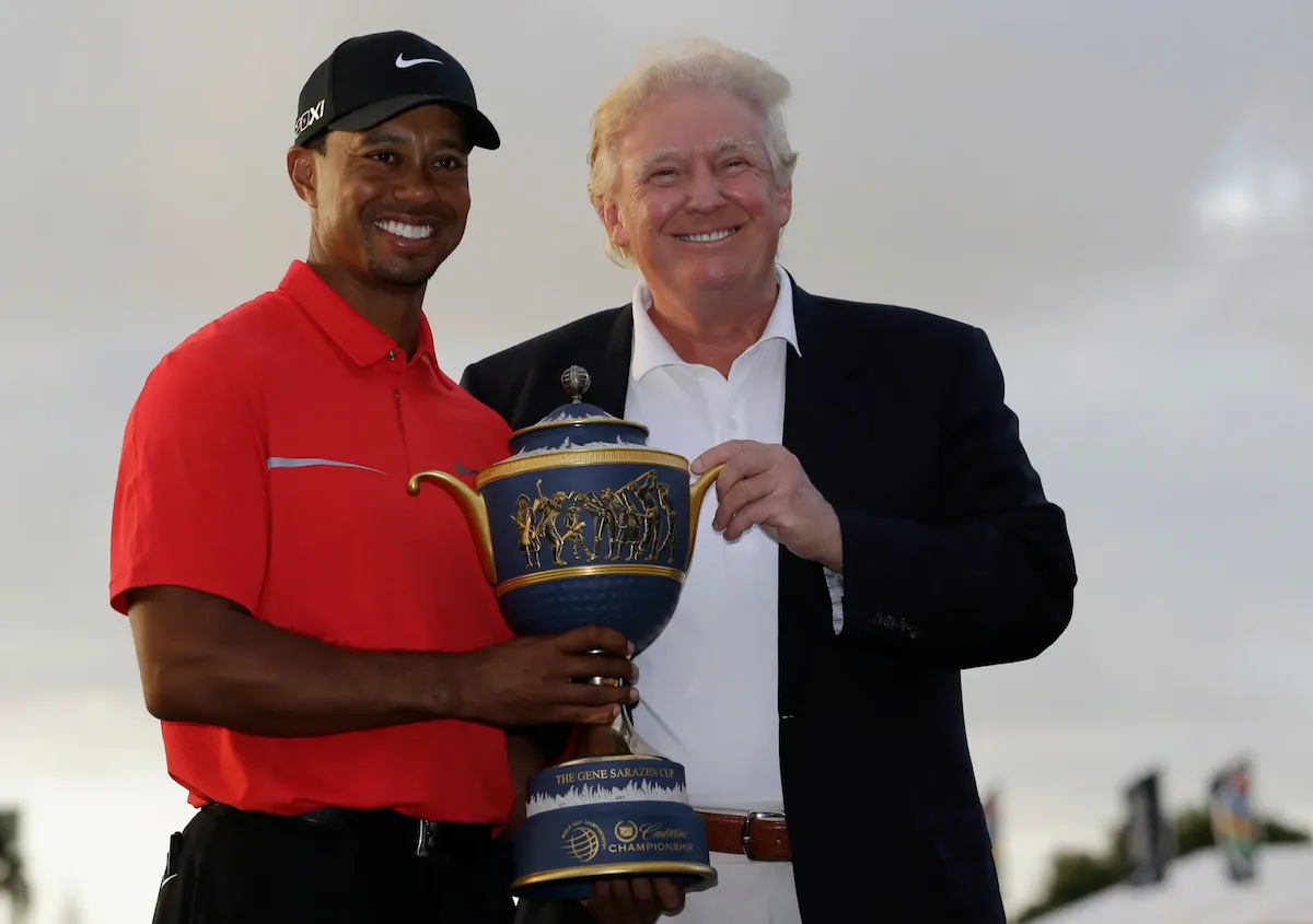 Тайгер Вудс із Дональдом Трампом після перемоги на Trump National Doral Miami у 2013 році. Трамп використав цю перемогу, щоб рекламувати свій гольф-клуб як один з найкращих у світі. Фото Wilfredo Lee / AP