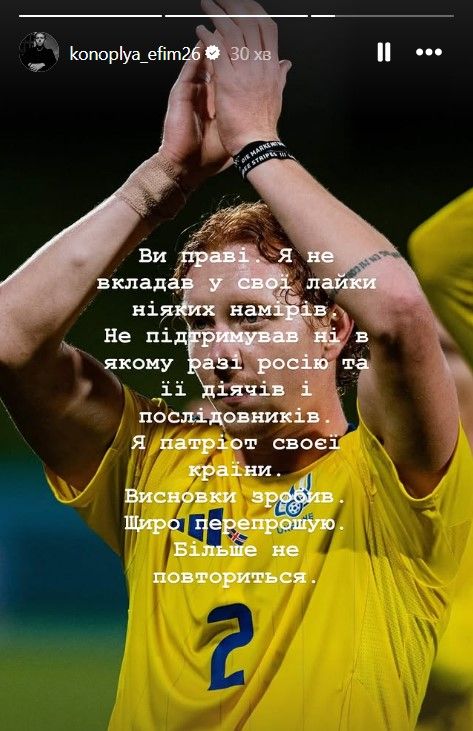 Фланговий захисник збірної України спершу прокоментував ситуацію, а згодом визнав свою помилку. Вибачення Юхима Коноплі з'явилось декілька хвилин тому у його профілі в інстаграмі, передає 24 Канал.